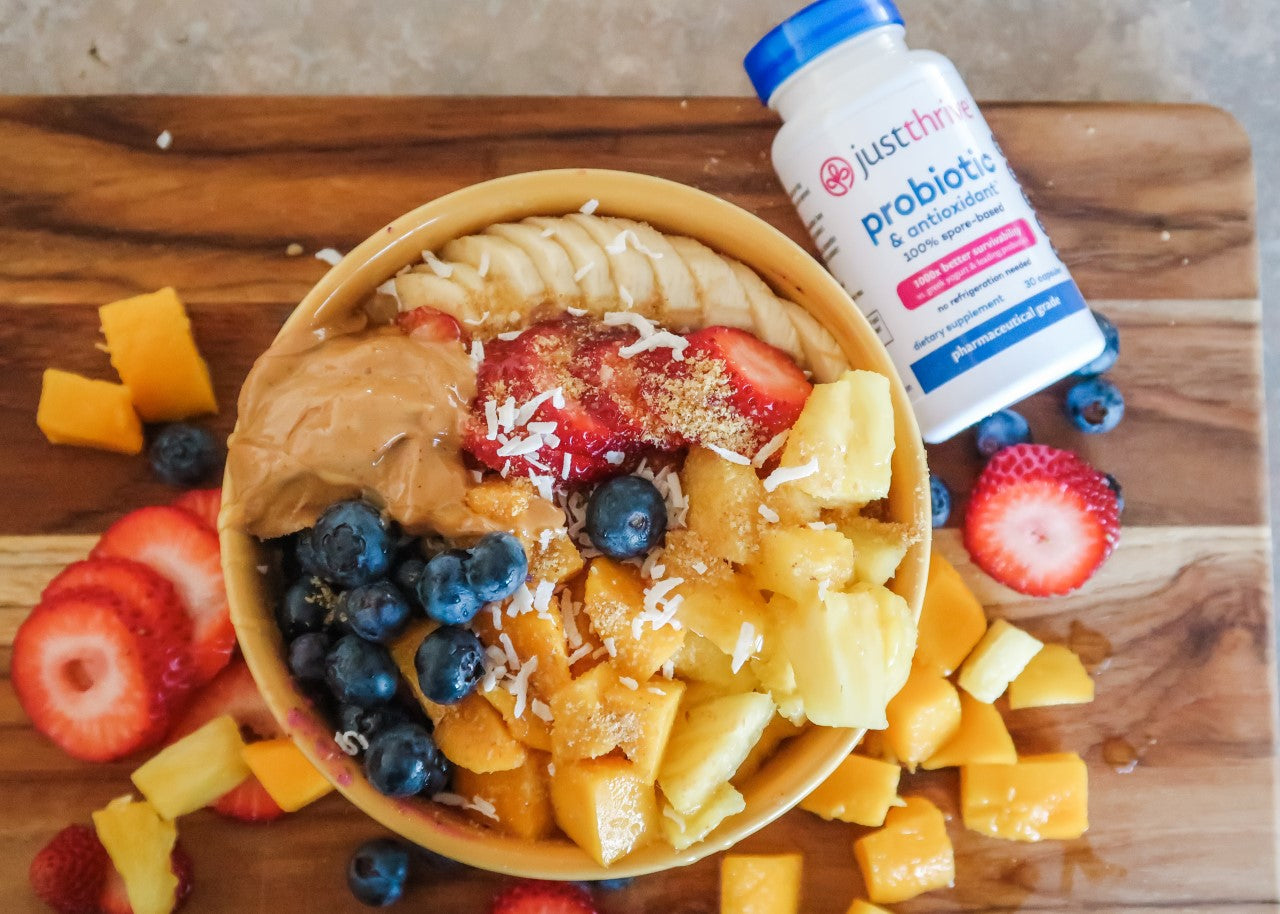 In a blender or food processor, mix together all the base ingredients until smooth. Pour the base into two bowls and top with a good balance of sliced fruit, granola, coconut, seeds, and maybe even some cacao nibs or honey! Take a picture of its beauty and tag Just Thrive probiotic on social media so we can see your delicious creation.