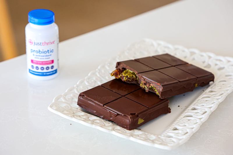 I used only the best ingredients: Medjool dates, Just Thrive Probiotic for gut health benefits, creamy sprouted pistachio butter, and rich dark chocolate.