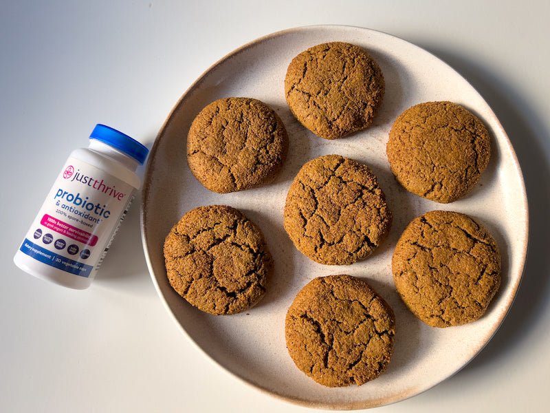 Picture this: soft, chewy cookies with just the right amount of spice, a caramel-like sweetness from molasses, and a subtle crunch of sugar on top. Every bite tastes like a cozy hug but better, because these cookies don’t just treat your taste buds; they also support your gut health with the power of Just Thrive Probiotic.