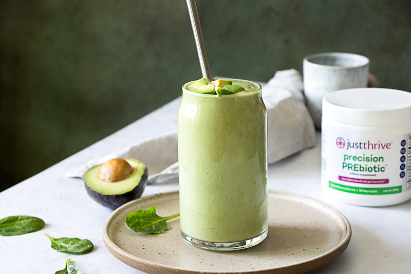 - Incorporating Just Thrive PREbiotic into the smoothie further supports gut health by nourishing beneficial bacteria and promoting microbial diversity. Prebiotics are non-digestible fibers that pass through the digestive tract intact, reaching the colon where they serve as food for probiotics—beneficial bacteria that support digestion and immune function.
