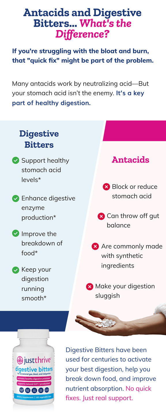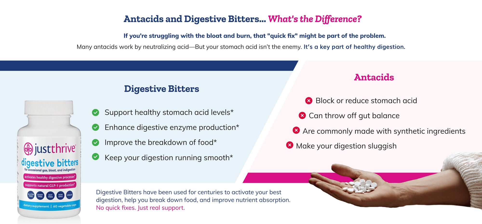 Just Thrive Digestion Bitters is the most comprehensive bitters product on the market. Unlike other digestive aids that only address symptoms, Just Thrive Digestive Bitters target the root cause of digestive issues. They work holistically to stimulate peak digestion, nutrient absorption, and metabolic balance. Plus, unlike traditional liquid bitters, Just Thrive Digestive Bitters come in tasteless capsules, providing all the benefits without the sugar, alcohol and the unpleasant taste.