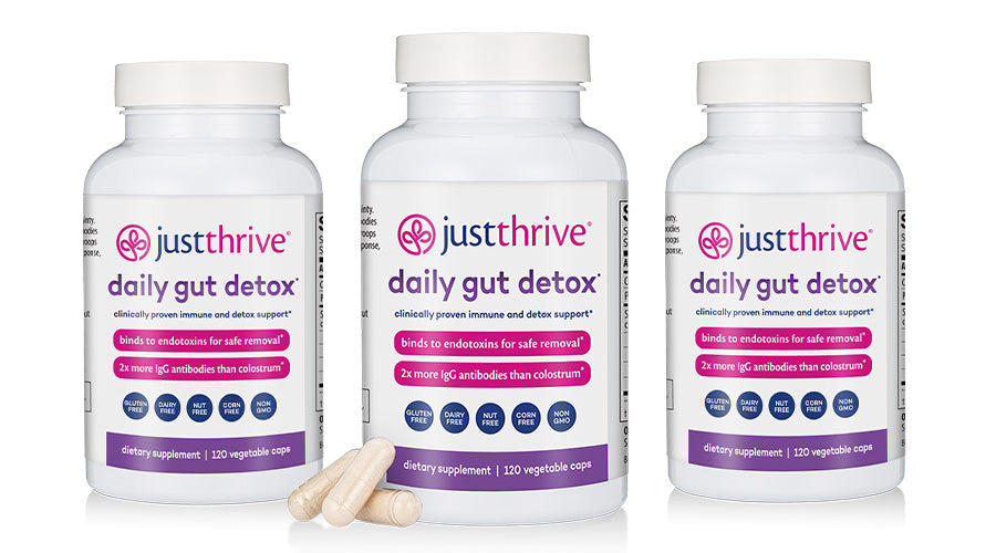 For die-off: Starting Just Thrive Probiotic and want to address any potential die-off symptoms? Take 4 caps at the same time as the Probiotic. Daily Gut Detox can neutralize toxins and mop up their toxic residue, helping you feel your best.