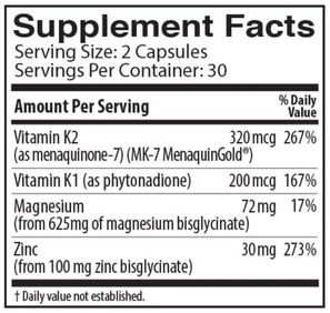 Just Thrive Vitamin K2-7 is derived from chickpea natto and contains the proper amount of zinc (from 150 mg zinc bisglycinate), magnesium (from 400 mg magnesium glycinate), and K1 (as phylloquinone) to allow the K2 to be absorbed and utilized effectively.